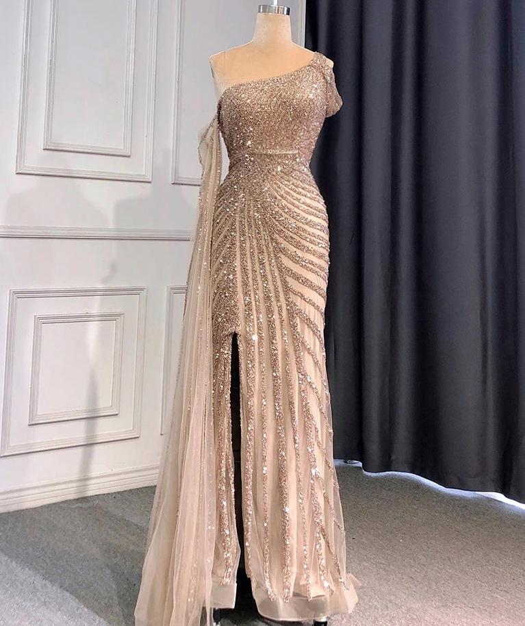 Radiate sophistication in this one-shoulder fitted gown. The fully embellished silhouette hugs the body with shimmering lines that elongate and define your curves. The asymmetrical neckline adds refined allure, while the delicate train creates a graceful, statuesque presence at any special event.
