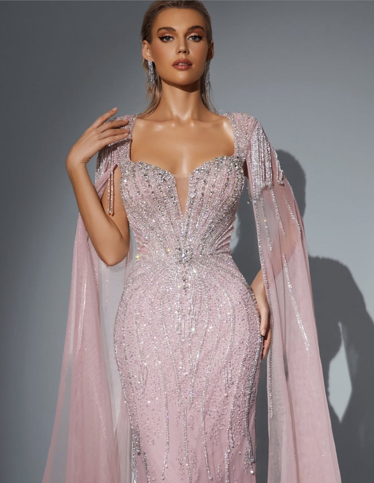 A fairytale creation, this blush strapless gown exudes dreamy elegance. The flowing cape adds drama and softness, while the fitted bodice enhances your figure with delicate sparkle.