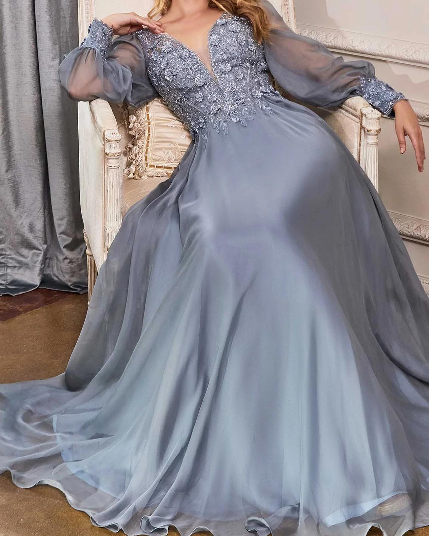 Fall in love with this elegant long-sleeve chiffon gown, perfect for the modern mother of the bride. The flowing chiffon skirt pairs beautifully with a delicately layered lace-appliqué bodice. Designed with a modest closed back and lightweight chiffon sleeves finished with lace cuffs, this gown offers both comfort and timeless sophistication.